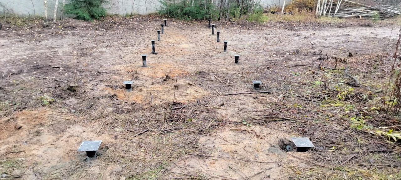 • Установка свай выполнена с использованием специализированного оборудования, что позволило добиться высокой точности. Каждая свая ввинчена строго по вертикали, независимо от перепадов высот участка.